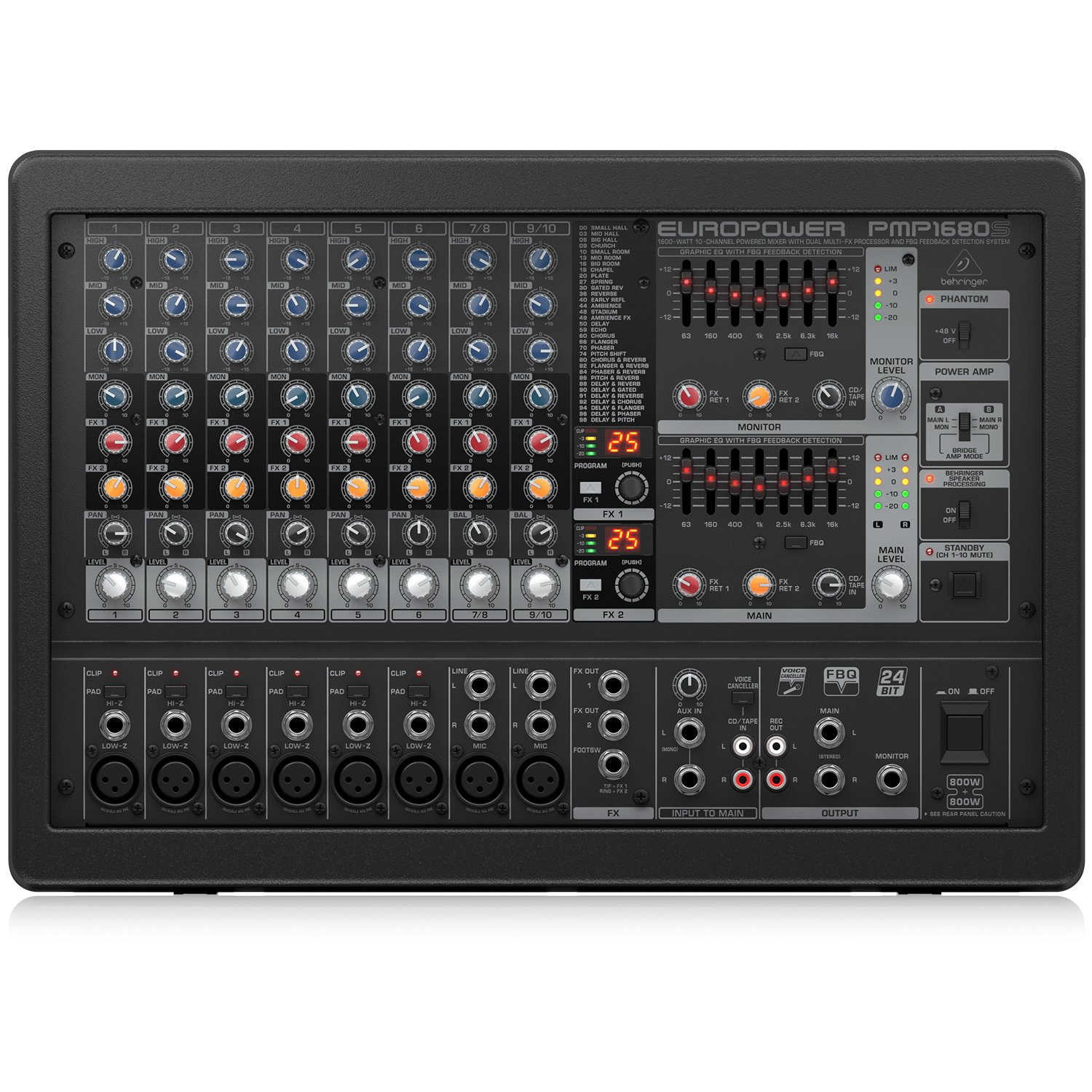 Behringer has provided 100 great sounding 24-bit stereo effects in the PMP1680S. You can apply the effects to your main outs as well as your monitor mixes. You have the tools you need to create a great sounding mix with 100 presets featuring reverbs, echo, chorus, delays, and more.