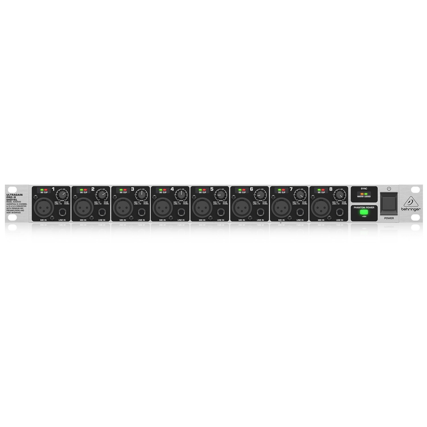 The ADA8000 is sublimely easy to operate, fits neatly into a single rack space and, thanks to the 8 IMP “Invisible” mic preamps with switchable +48 V Phantom Power and audiophile-grade 24-bit A/D – D/A converters, you get incredibly detailed, pristine performance. Signal conversion takes place at your choice of 44.1 or 48 kHz with full 24-bit resolution. The ADAT Inputs and Outputs can be operated independently, as long as you use an identical wordclock signal. And ADA8000’s operating frequency range is an ultra-wide 10 Hz to 24 kHz – at a very respectable, 48 kHz sampling rate. Put simply, the ULTRAGAIN ADA8000 is the professional’s edge.