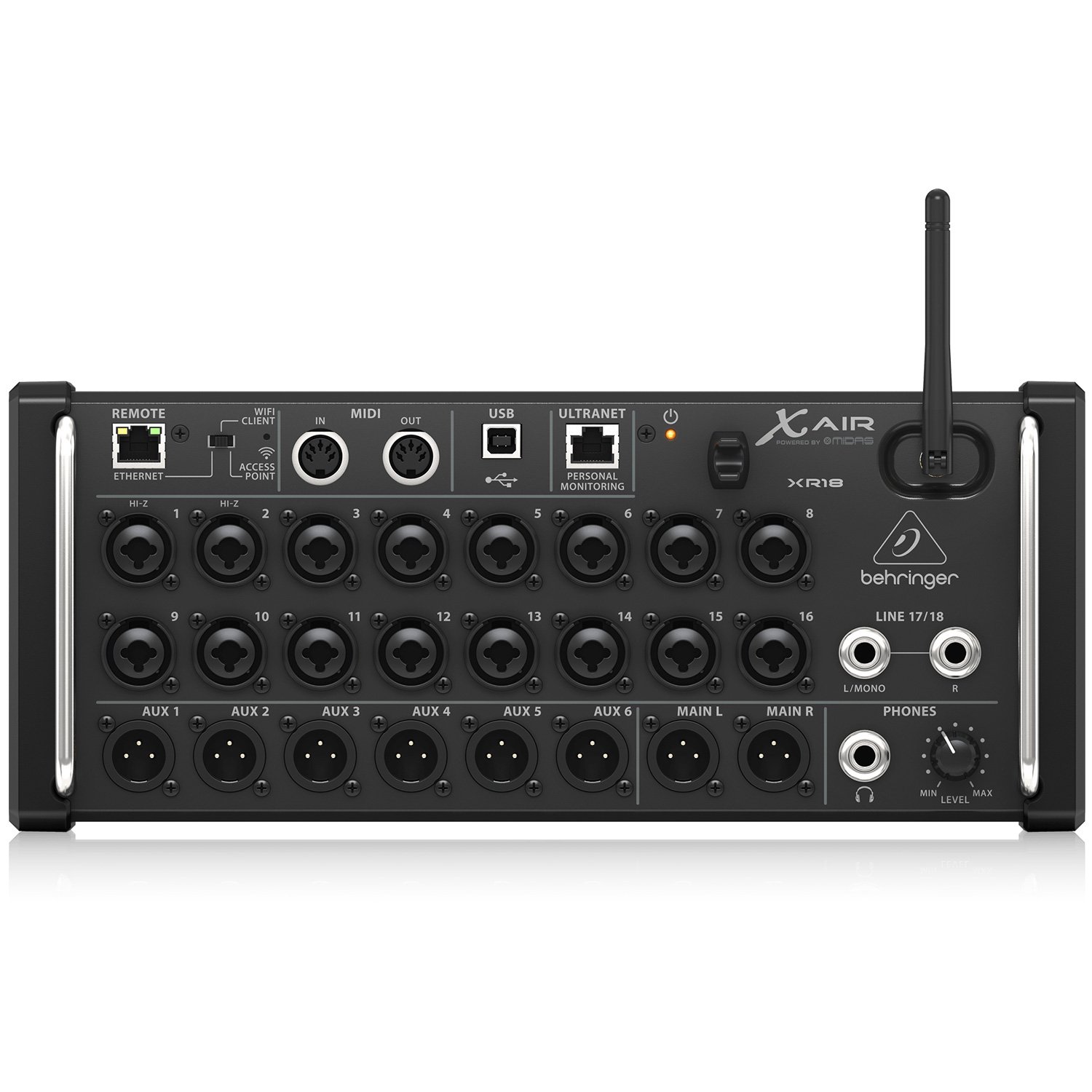 Behringer’s cutting-edge X Air digital mixers integrate with your iPad or Android tablet for unprecedented mixing power and mobility. Plug in your mic and line level sources and mix from anywhere in the venue or studio via the free remote control app. The XR18 is an 18-input, rackmountable stage box unit with 16 gain-programmable Midas-designed microphone preamps, two hi-Z inputs, Behringer’s renowned X32 effects rack, a 100-band Real Time Analyzer on all channel and bus EQs, an 18 x 18 USB interface, and integrated Wi-Fi, all in a convenient rackmount chassis. Just add mics, and you have everything you need to mix a live show and record pristine multitrack sessions straight to your DAW. Complete with the ability to integrate with pre-existing P16 series personal mixers, the Behringer XR18 gives you a whole new way to mix.