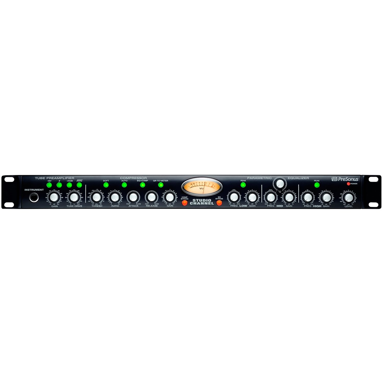 The PreSonus Studio Channel is the perfect way to step-up the quality of your recordings! This fully featured channel strip delivers a Class A tube microphone/instrument preamplifier, a variable VCA compressor, and a 3-band parametric EQ complete with VU metering – all at a ridiculously great price. If you’re currently working on stock interface or mixer preamplifiers, you won’t believe how incredible the same sources sound through the Studio Channel. Experience all that signature fat tube tone plus the full-on ability to tweak – the PreSonus Studio Channel’s bound to become your “go-to” box!